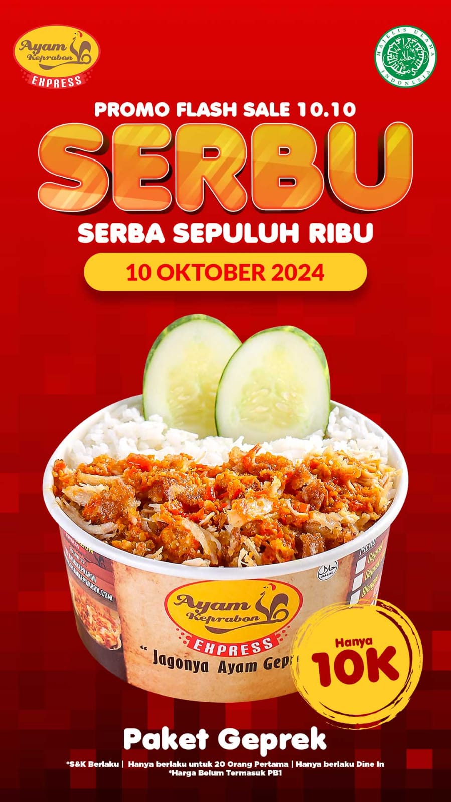 SIAP SIAP SERBU PROMO FLASH SALE 10.10 ?? Kapan lagi bisa nikmatin Paket Geprek cuma 10ribu ajaaa... Catat tanggal promonya, jangan sampai kehabisan yaa... ??? S&K: ? Harga Rp 10.000 (exclude PB10%) ? Berlaku untuk 1 porsi Paket Geprek (Original, Bohay, Rica & Matah) ? Berlaku untuk pembelian dine in/makan di tempat ? Berlaku untuk 20 pembeli