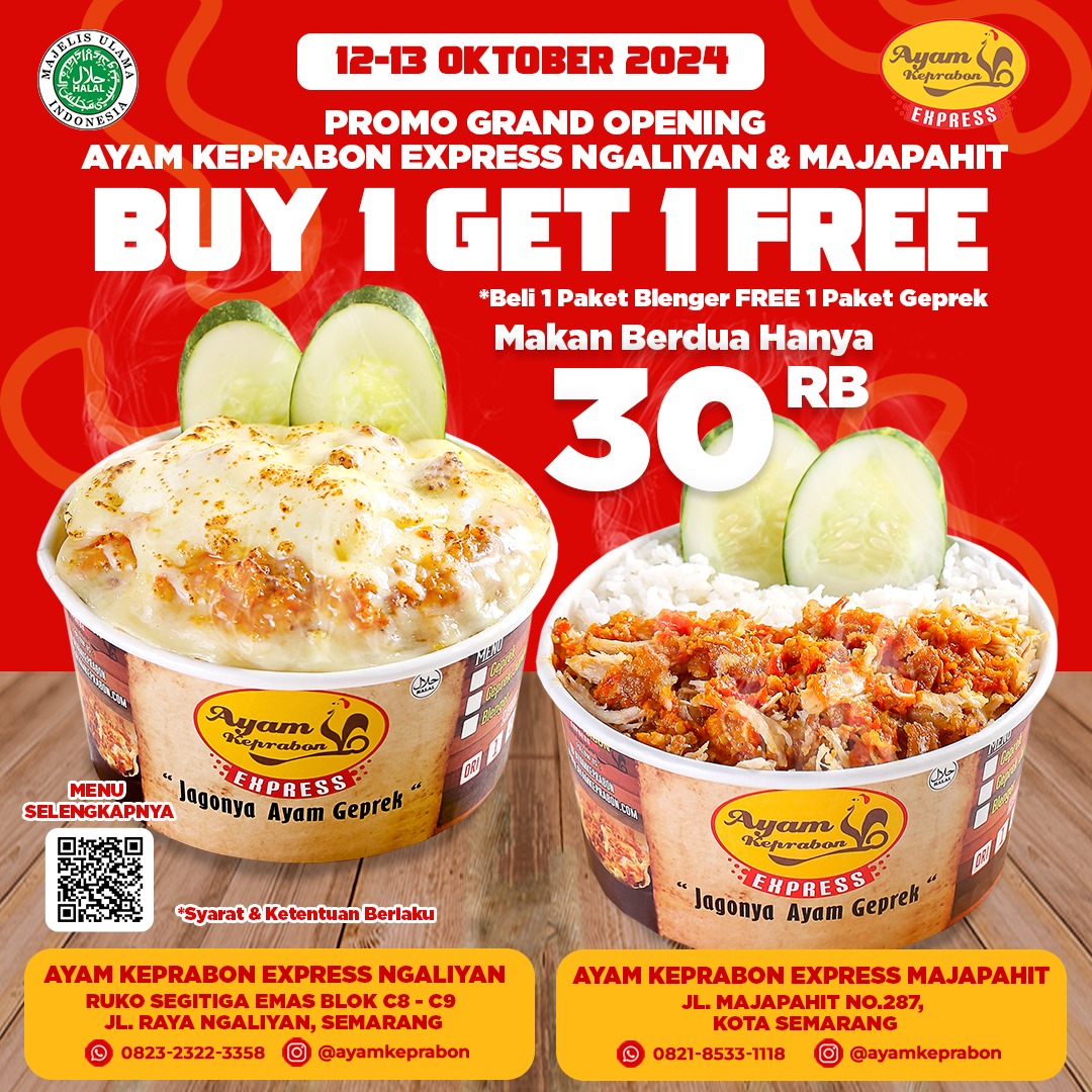 AYAM KEPRABON OPENING 2 CABANG SEKALIGUS DI SEMARANG ??? Yeeeaayy warga Semarang bakal makin dekat dengan Ayam Keprabon karena akan nambah 2 cabang sekaligus di daerah Ngaliyan dan Jalan Majapahit Pedurungan Semarang... Datang, ramaikan dan borong promonya, kalau kamu beli 1 porsi Paket Blenger dapet FREE 1 porsi Paket Geprek... Mimin tunggu