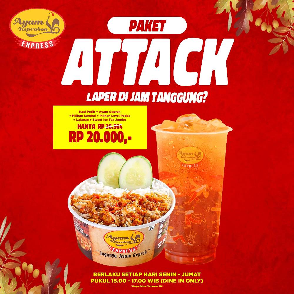 LAPAR DI JAM TANGGUNG - PROMO ATTACK KEPRABON SOLUSINYA ??? Yeeeyy, PROMO ATTACK come baaacckk!!! Mimin emang gak akan biarin kamu lama-lama oleng, pokoknya harus balik lagi nikmatin PROMO ATTACK~ S&K: ? Harga Rp 20.000 (exclude PB1 10%) ? Promo Attack : Paket Geprek + Sweet Ice Tea Jumbo ? Berlaku setiap hari Senin - Jumat