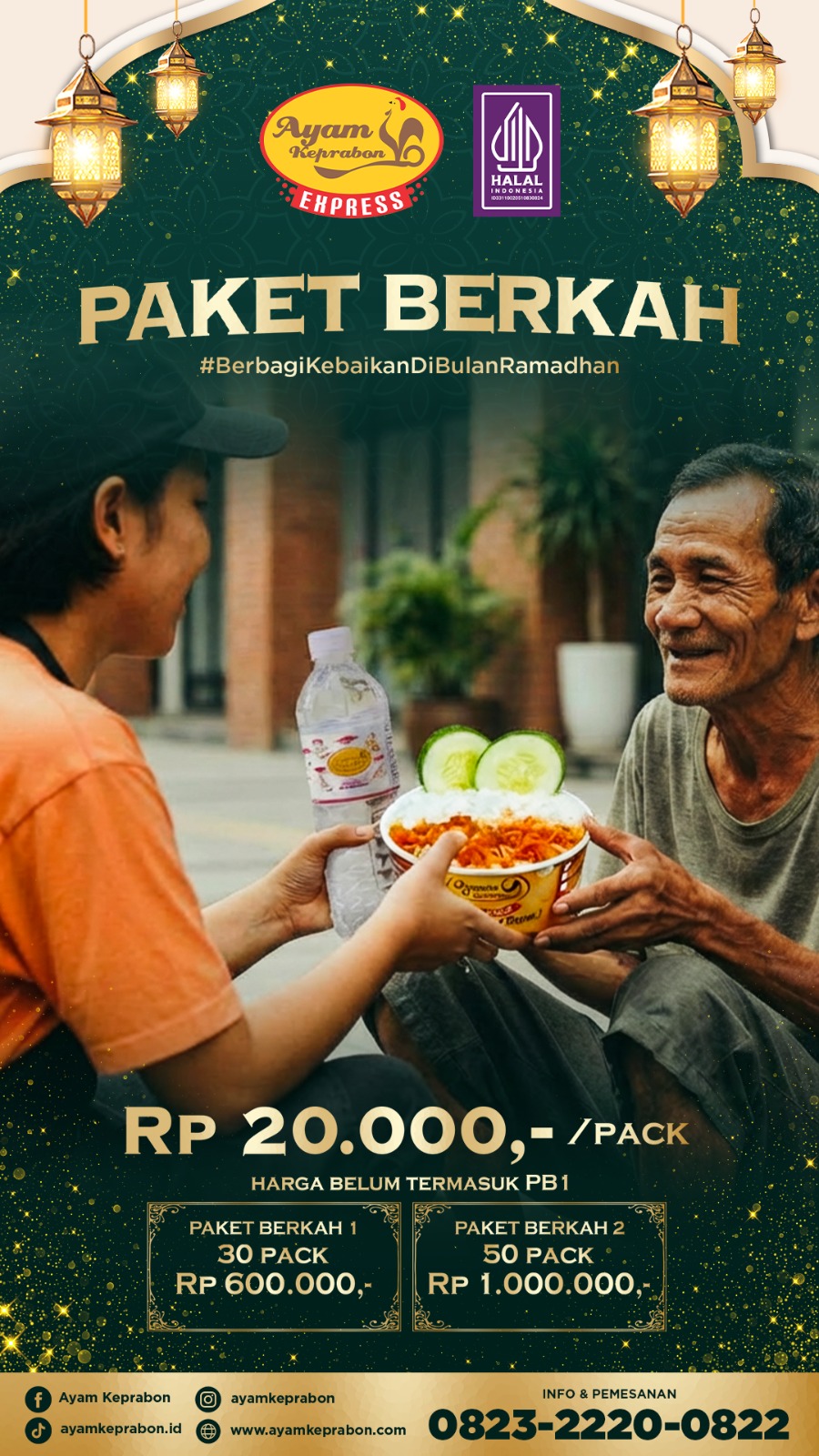 Ramadhan adalah tentang berbagi, sekecil apa pun itu sangatlah berarti ? Lewat Paket Berkah Ayam Keprabon, satu pack sederhana bisa jadi senyum untuk mereka yang membutuhkan. ? Paket Berkah 1 Rp 600.000 mendapat 30 Paket Donasi (untuk 30 orang penerima donasi) ? Paket Berkah 2 Rp 1.000.000 mendapat 50 Paket Donasi (untuk 50 orang penerima donasi) ? Menu