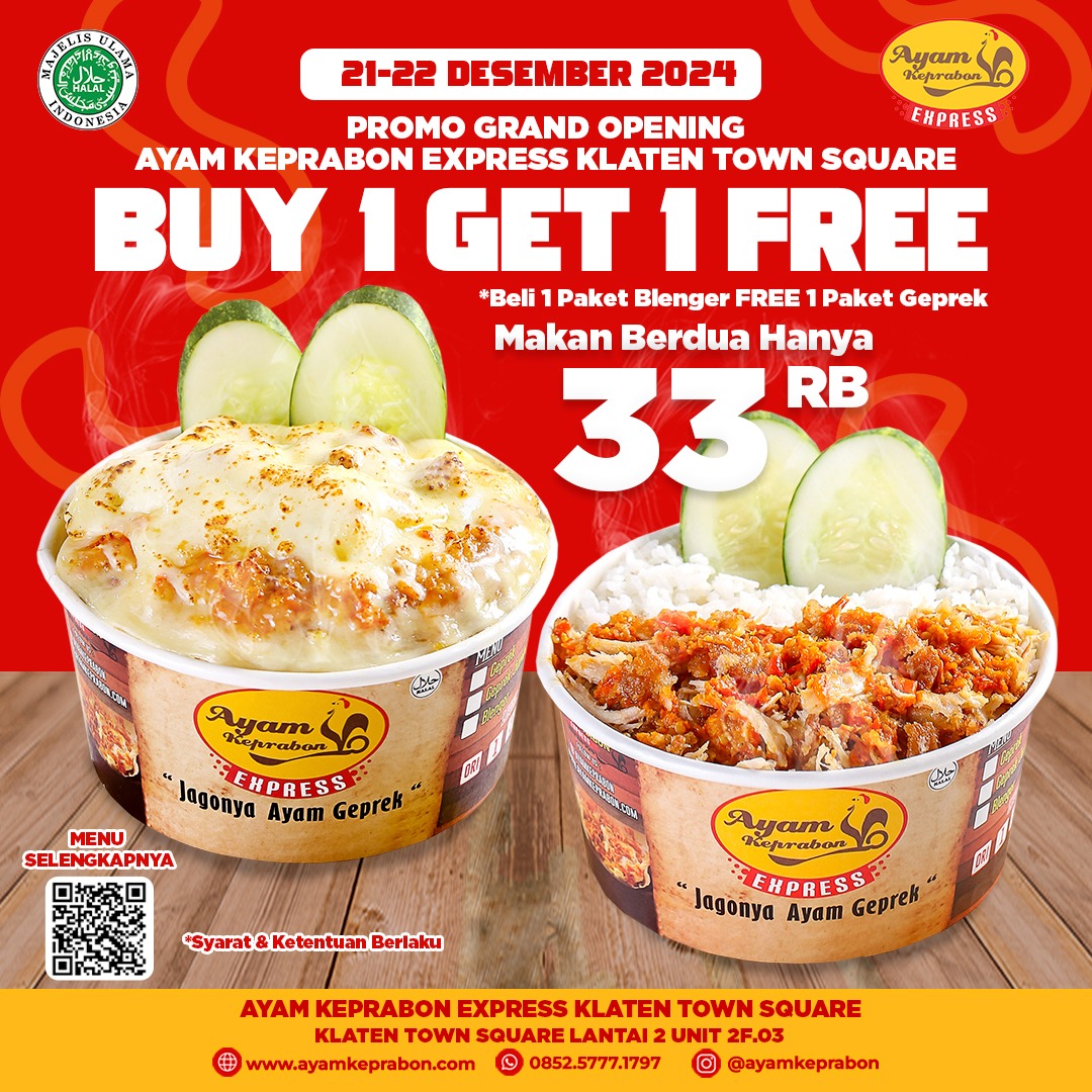 HAI WARGA KLATEN - SETELAH BANYAK YANG REQUEST...??? Yeeeaayy, akhirnya terealisasi juga Ayam Keprabon nambah cabang baru di Klaten, tepatnya di Klaten Town Square.... ??? Catat yaa, grand openingnya besok tgl 21- 22 Desember 2024... Wajib banget diserbu warga Klaten sih ini karena pastinya ada promo Buy 1 Get 1 FREE, yang berlaku