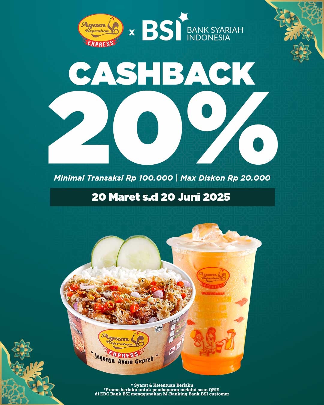 Lebih Hemat, Lebih Cuan di Ayam Keprabon?? Pake Bank Syariah Indonesia, dapetin Promo Cashback 20% maksimal Rp 20.000 syarat minimal transaksi Rp 100.000~ Siapa yang bisa nolak cashback pas lagi makan enak? Langsung order sekarang! S&K: - Periode program berlaku sejak 20 Maret s.d 20 Juni 2025 - Promo berlaku untuk pembayaran melalui scan