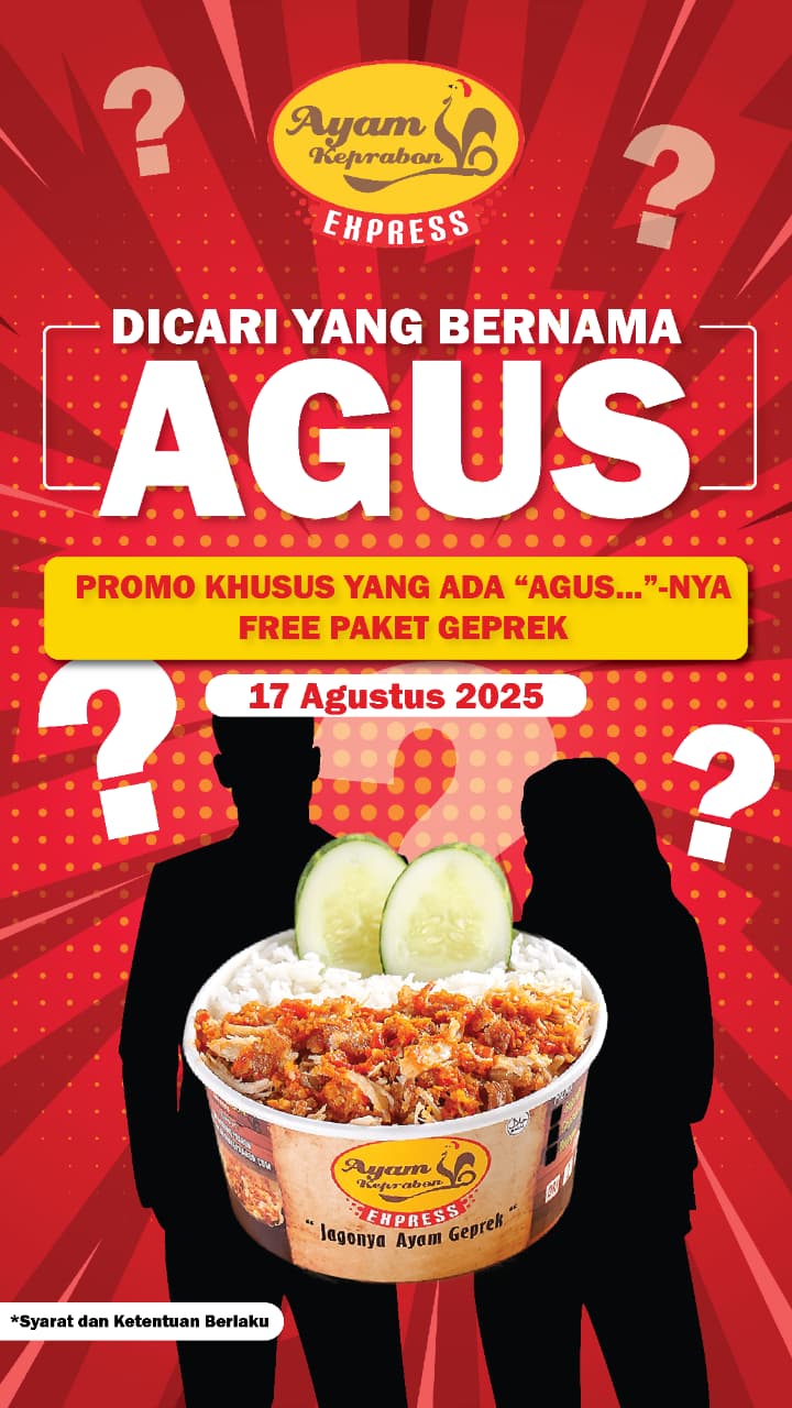 ? DICARI: AGUS, AGUSTIN & @agustd ??‍?? Pokoknya yang punya nama ada “AGUS”-nya, buruan merapat yuuukk!! Kamu berhak dapet FREE PAKET GEPREK dari Ayam Keprabon! ?? ? Hanya berlaku tanggal 17 Agustus 2025 ? Spesial memperingati Hari Kemerdekaan dengan menunjukkan KTP Tag temanmu yang namanya AGUS, biar nggak kelewatan rezeki pedas ini~
